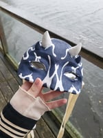 One of six individually designed masks, unique in their own way. Faced with red felt for so that once worn, it resembles a second skin. Long lengths of twill offer endless adjustability or preference.