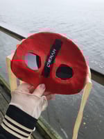 One of six individually designed masks, unique in their own way. Faced with red felt for so that once worn, it resembles a second skin. Long lengths of twill offer endless adjustability or preference.
